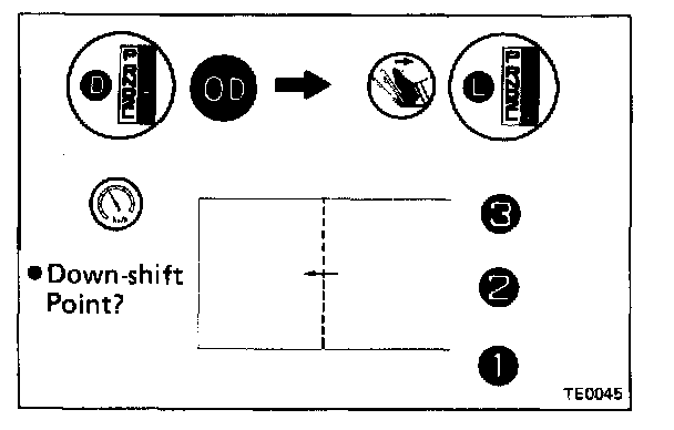 g. While running in the D range, release your foot from the accelerator pedal and shift into L range. Then check to see if OD -> 3 and 3 -> 2 and 2 -> 1 down-shift points conform to those indicated on the automatic shift diagram.