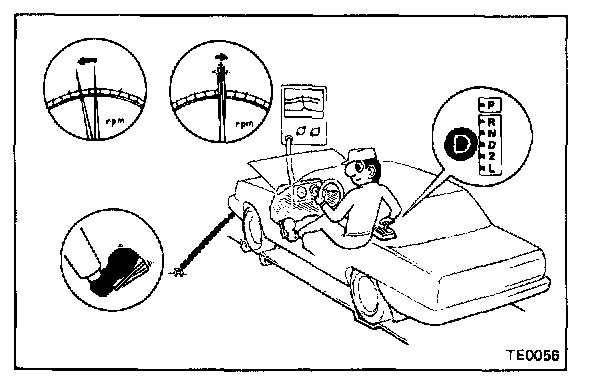 Shift into the D range, and while driving with the accelerator pedal held constant at specified point (50 % and 100 %) and OD switch ON, check on the following points.