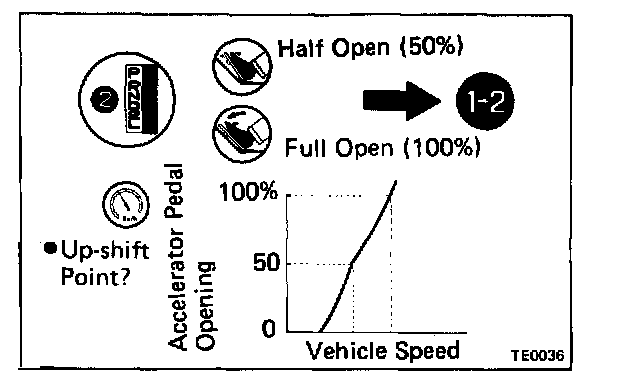 a. Shift to 2 range and run with the accelerator pedal opening at 50 % and 100 % respectively. Then check the 1 2 up-shift points at each of the accelerator pedal openings to see that it conforms to those indicated on the automatic shift diagram.