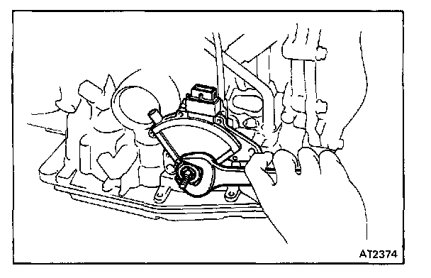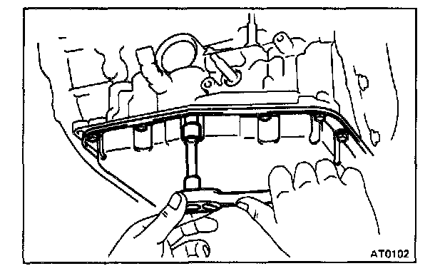 b. Remove oil pan by lifting the transmission case.