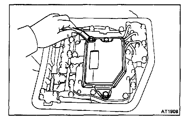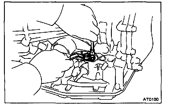 CAUTION: Do not turn the transmission over as this will contaminate the valve body with foreign material in the bottom of the pan.
