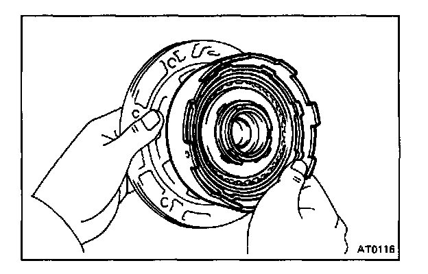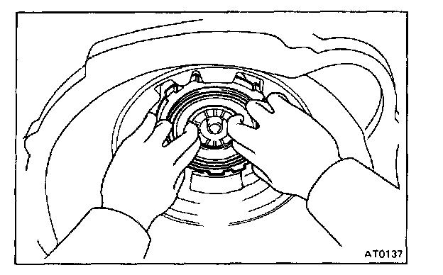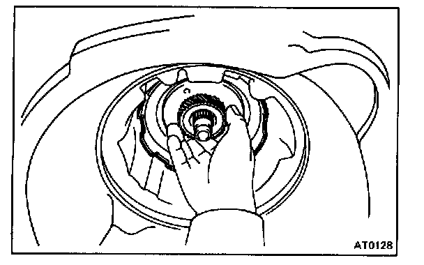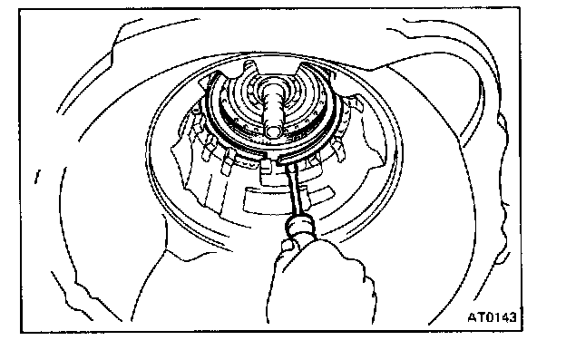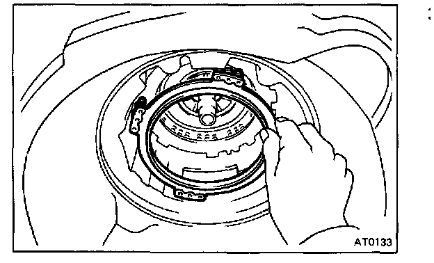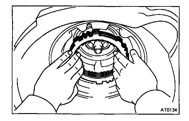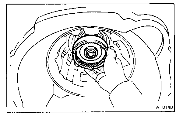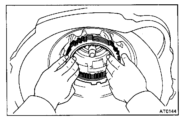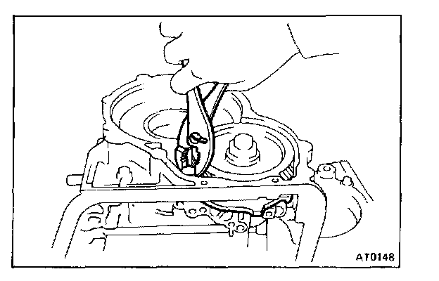 CAUTION: Push the 2nd coast brake band into the case, being careful not to catch it on the direct clutch drum.