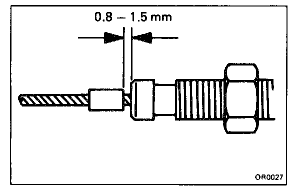 c. Stake the stopper 0.8 - 1.5 mm (0.031 - 0.059 in.) from the surface of outer cable as shown.