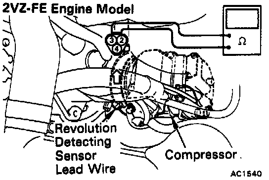 5. Check revolution detecting sensor. Using an ohmmeter, measure the resistance between two terminals of the sensor.