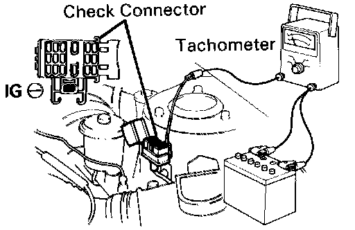 b. Connect the test probe of a tachometer to the terminal IG (-) of the check connector.