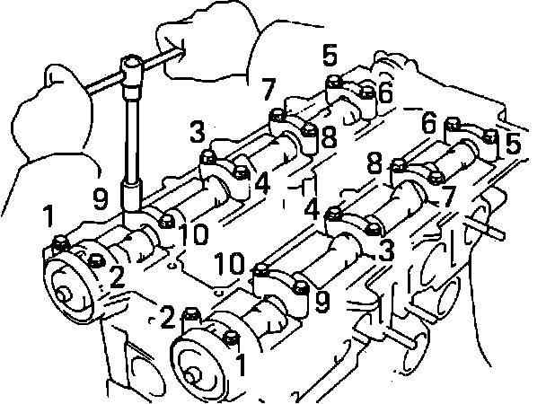 Fig. 6 Intake & Exhaust Camshaft Bearing Cap Bolt Loosening Sequence.:
