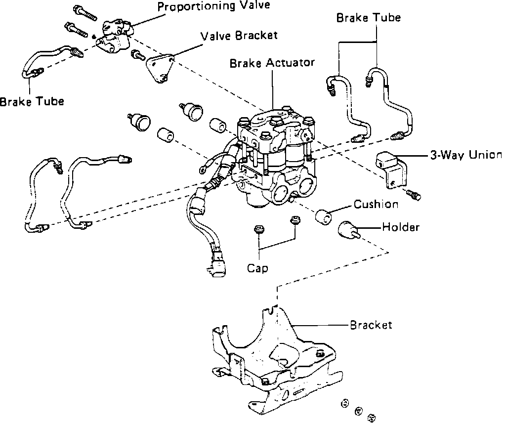 The actuator provides ABS fluid pressure control. It modulates wheel circuit hydraulic pressure to prevent wheel lockup. The actuator is made up of three solenoid valves, a return pump, two accumulator chambers, the pump motor relay, and a solenoid valve relay.