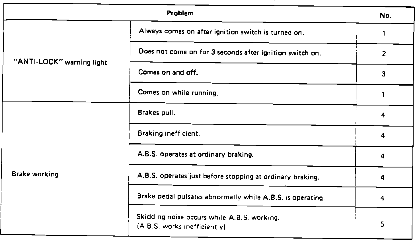After checking the operation of the "ANTILOCK" warning light and checking the operation of the brake system on a test drive, refer to the chart for the correct symptoms displayed by the vehicle. The number (N0.) column indicates the DIAGNOSTIC PROCEDURE where testing should start.
