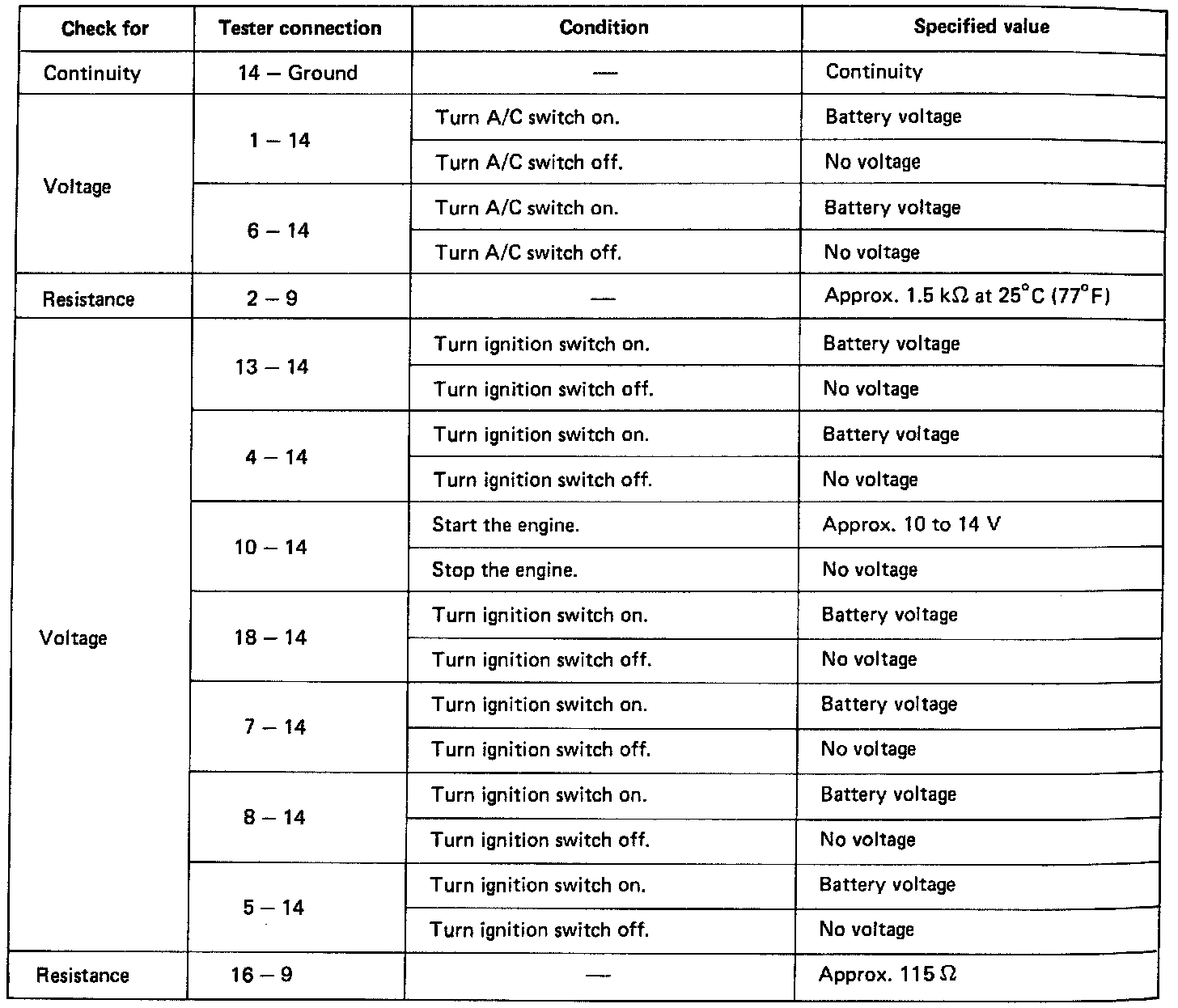 Disconnect the amplifier and inspect the connector on the wire harness side as shown in the chart.
