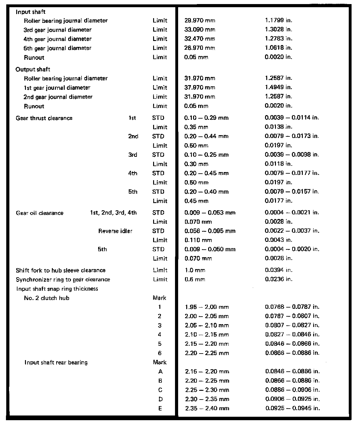 S53 5-spd M/T, Shaft Diameter/Gear Clearances: