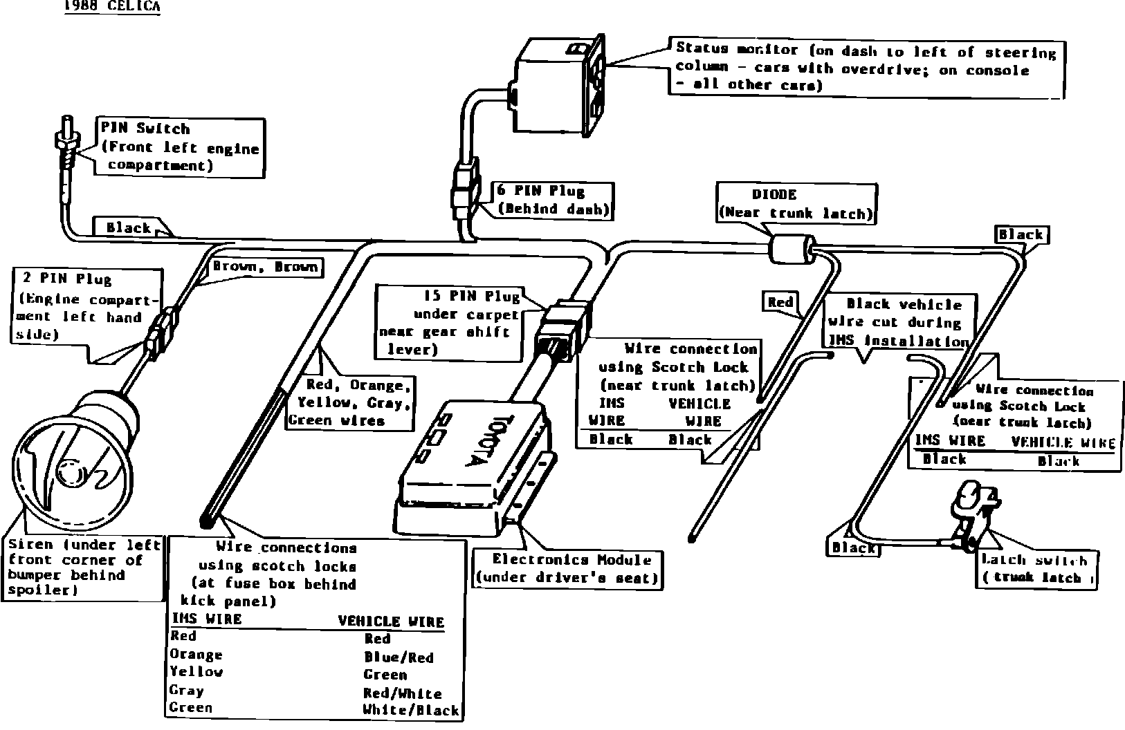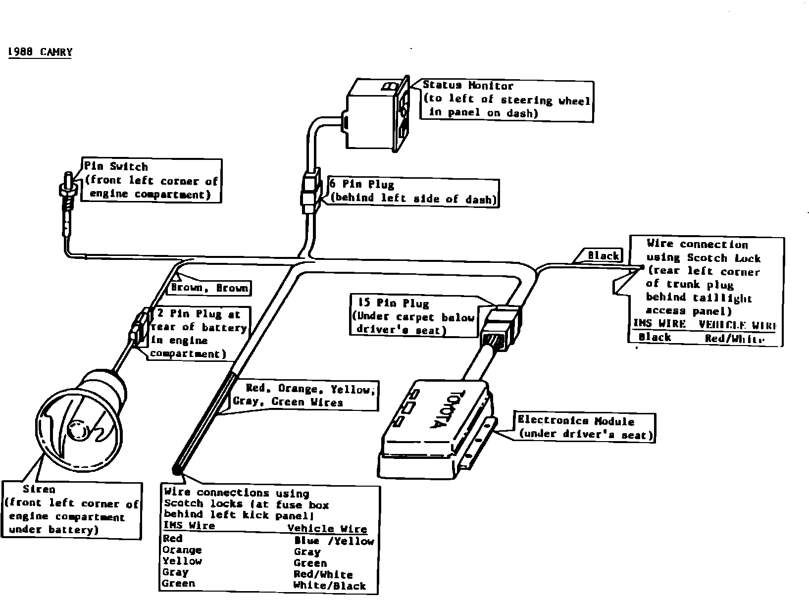 The components in the enclosed drawings are shown in their approximate relative positions and are identified by component name and location in the vehicle. The drawings are not to scale. Where wire connections exist between the IMS System and the vehicle wiring, wire colors on both sides of the kit Scotchlock connections are indicated. The functions of the various IMS system wires are described completely and in detail in Toyota service Bulletin, Volume VIII, Number 008, issued December 2, 1985. Please refer to this Bulletin for further details. Briefly, the functions are as follows:
