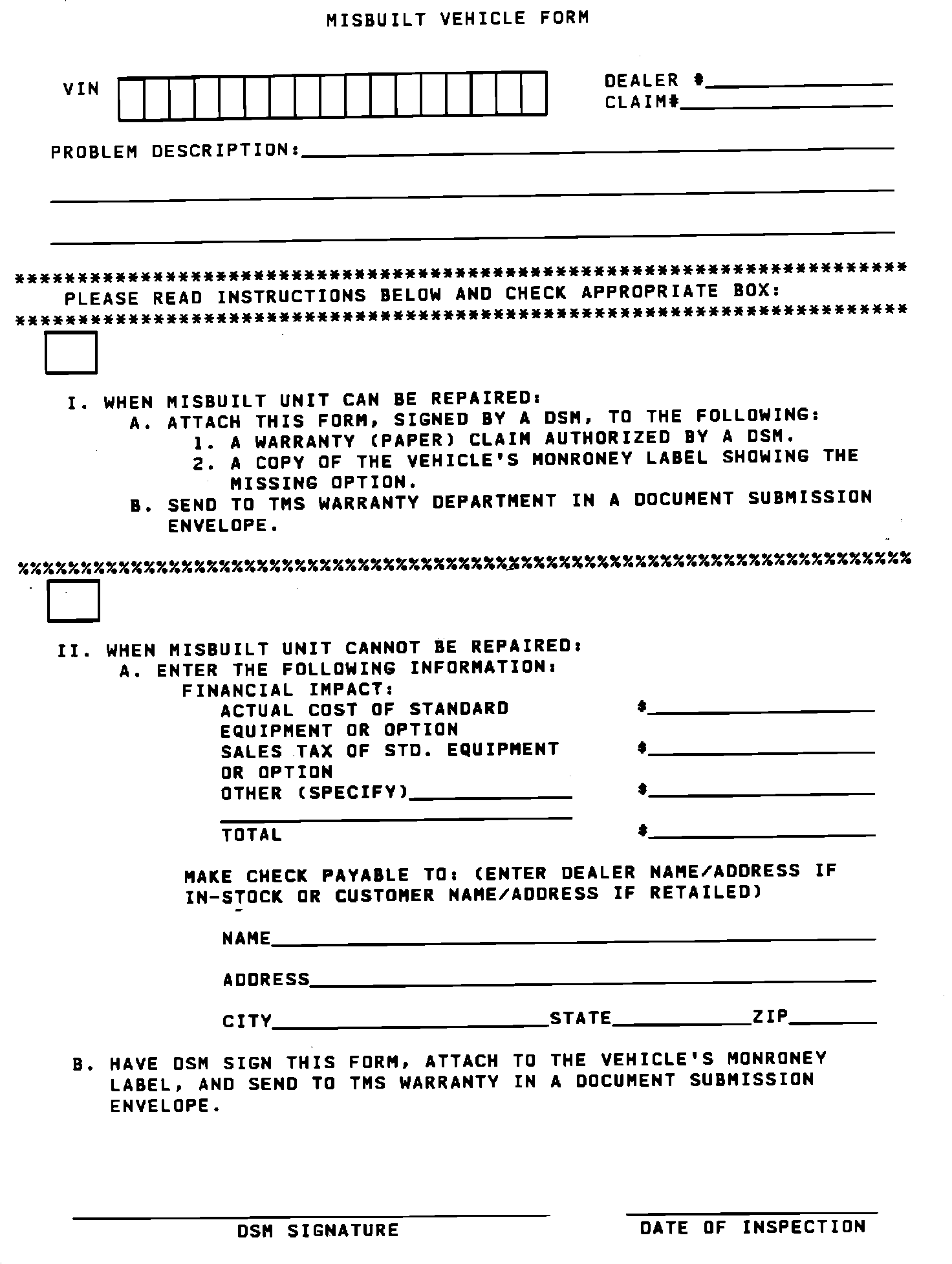 - Submit a (paper) warranty claim, the vehicle's Monroney label and a new MISBUILT UNIT FORM (see attached) to TMS Warranty in a document submission envelope. The dealer will be paid for any related repair.