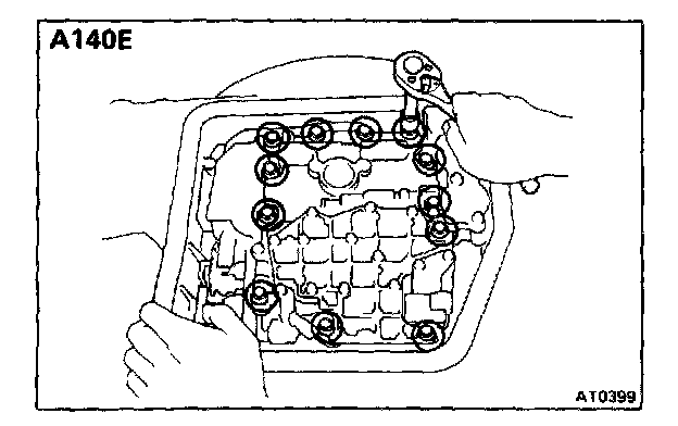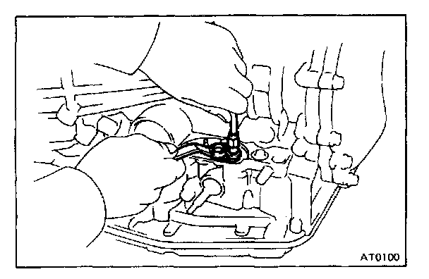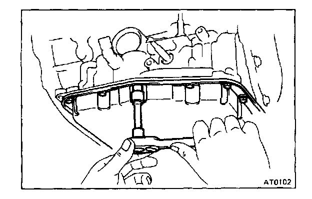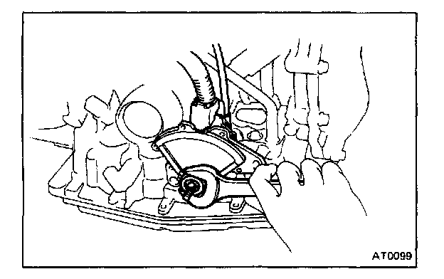 b. Remove oil pan by lifting the transmission case.