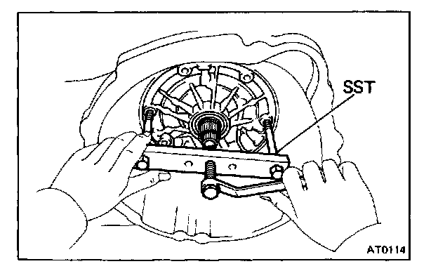 21. PULL OIL PUMP FREE WITH SST FROM TRANSMISSION CASE