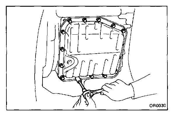 CAUTION: Some fluid will remain in the oil pan. Remove all pan bolts, and carefully remove the pan assembly. Discard the gasket.