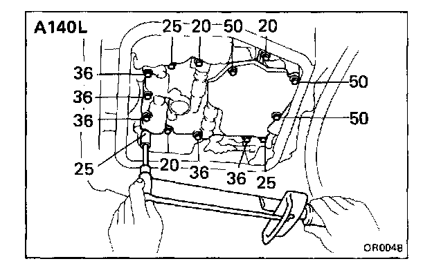 NOTE: Each bolt length (mm) is indicated in the figure. Finger tighten the all bolts first. Then tighten them with a torque wrench.