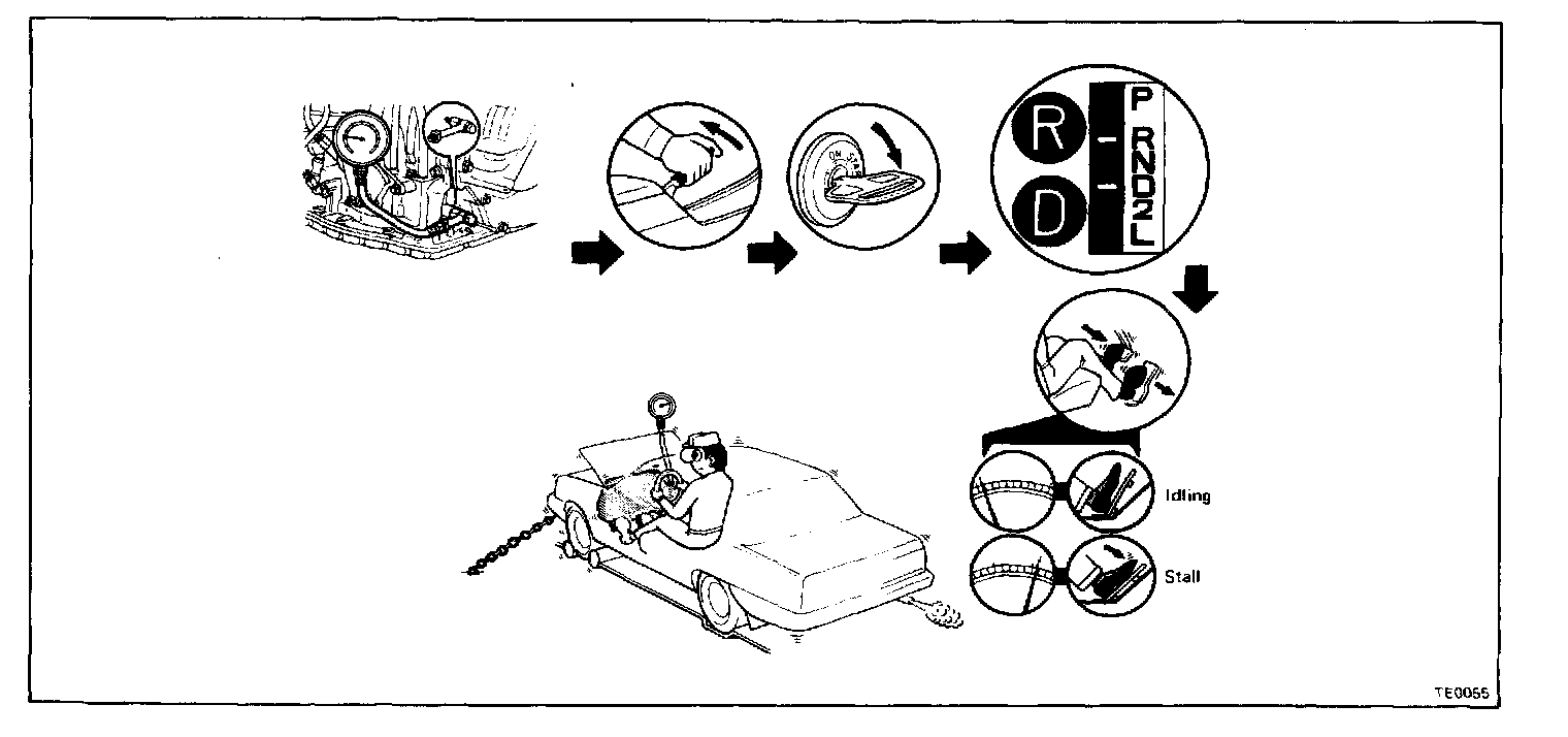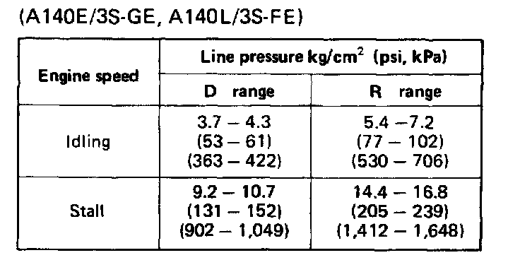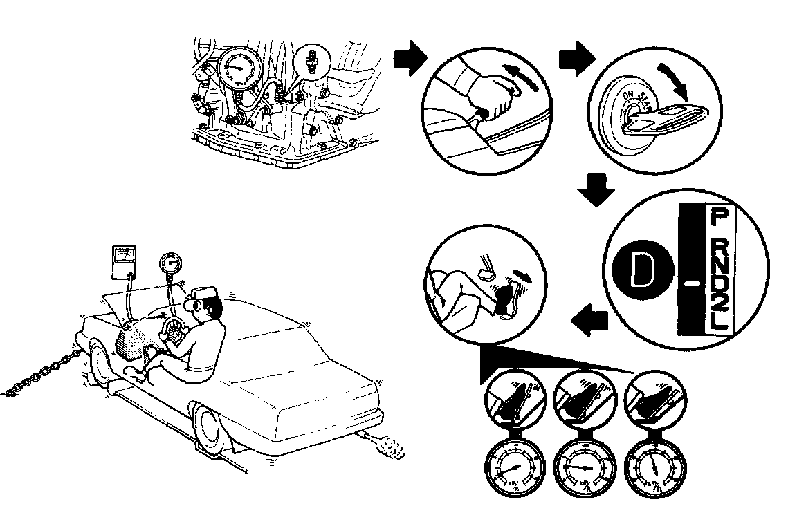 c. Shift into D range, step down strongly on the brake pedal with your left foot and while manipulating the accelerator pedal with the right foot, measure the line pressure at the engine speeds specified in table.