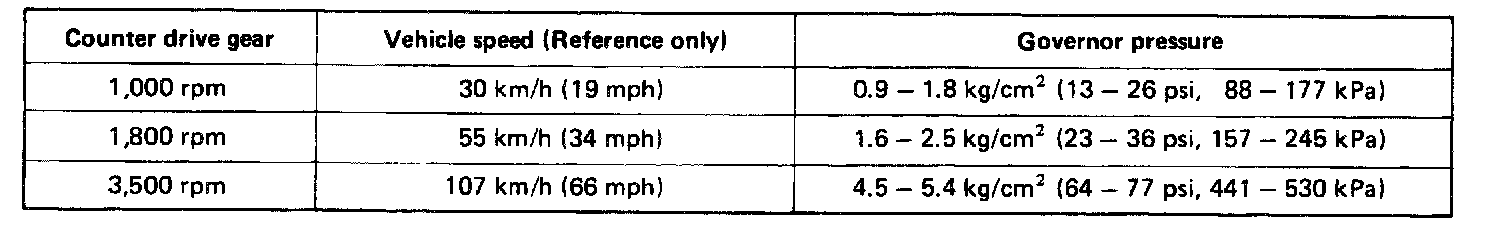 c. Shift into D range and measure the governor pressures at the speeds specified in the table.