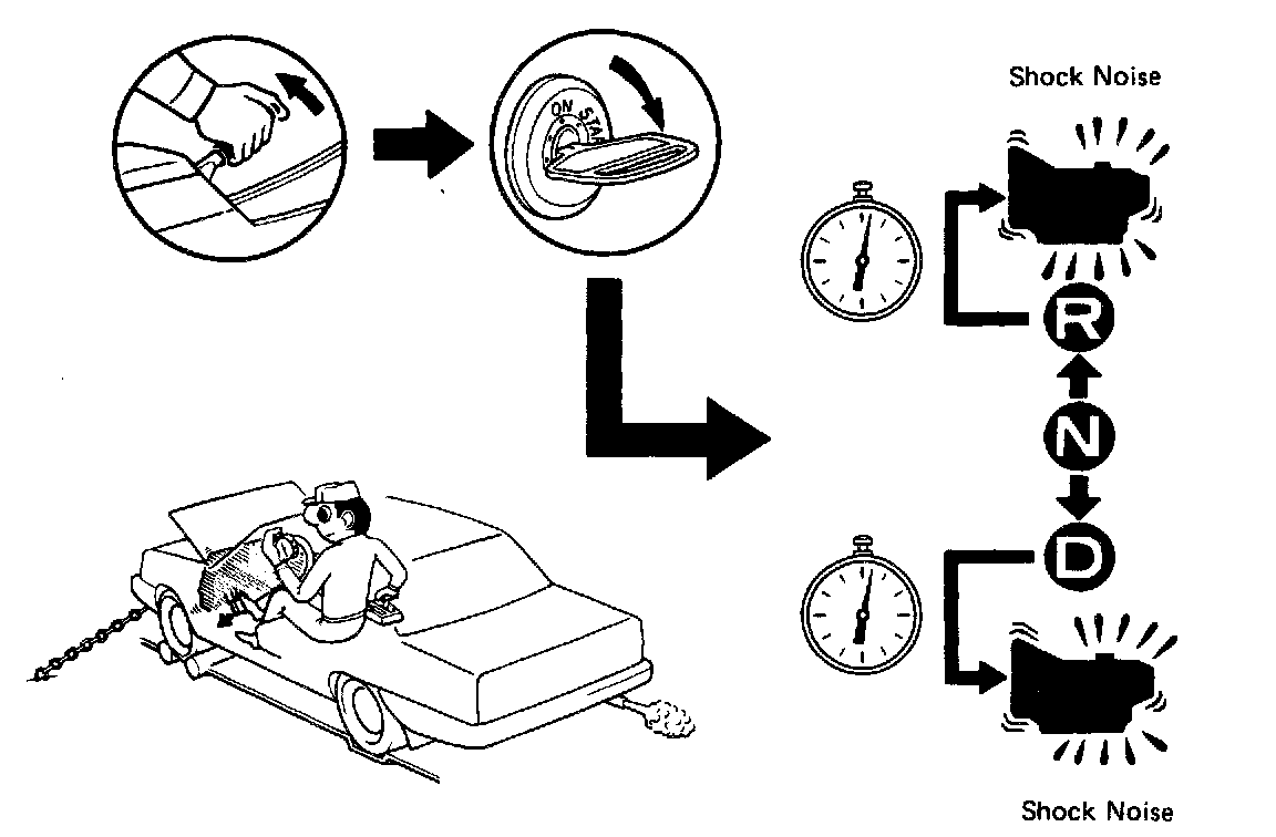 If the shift lever is shifted while the engine is idling, there will be a certain time elapse or lag before the shock can be felt. This is used for checking the condition of the OD clutch, forward clutch, direct clutch and first and reverse brake.