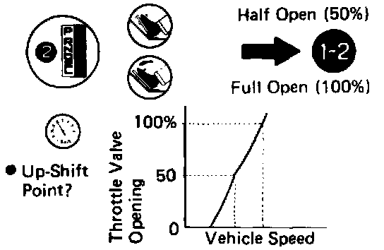 A. Shift to 2 range and run with the throttle valve opening at 50% and 100% respectively. Then check the 1 -> 2 up-shift points at each of the throttle valve openings to see that it conforms to those indicated on the automatic shift diagram.
