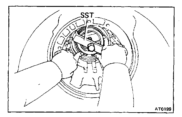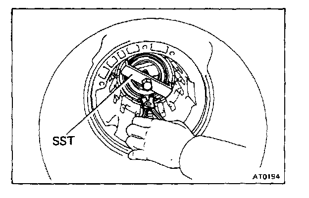 a. Install SST. Tighten the bolt gradually and evenly to compress the springs with SST.