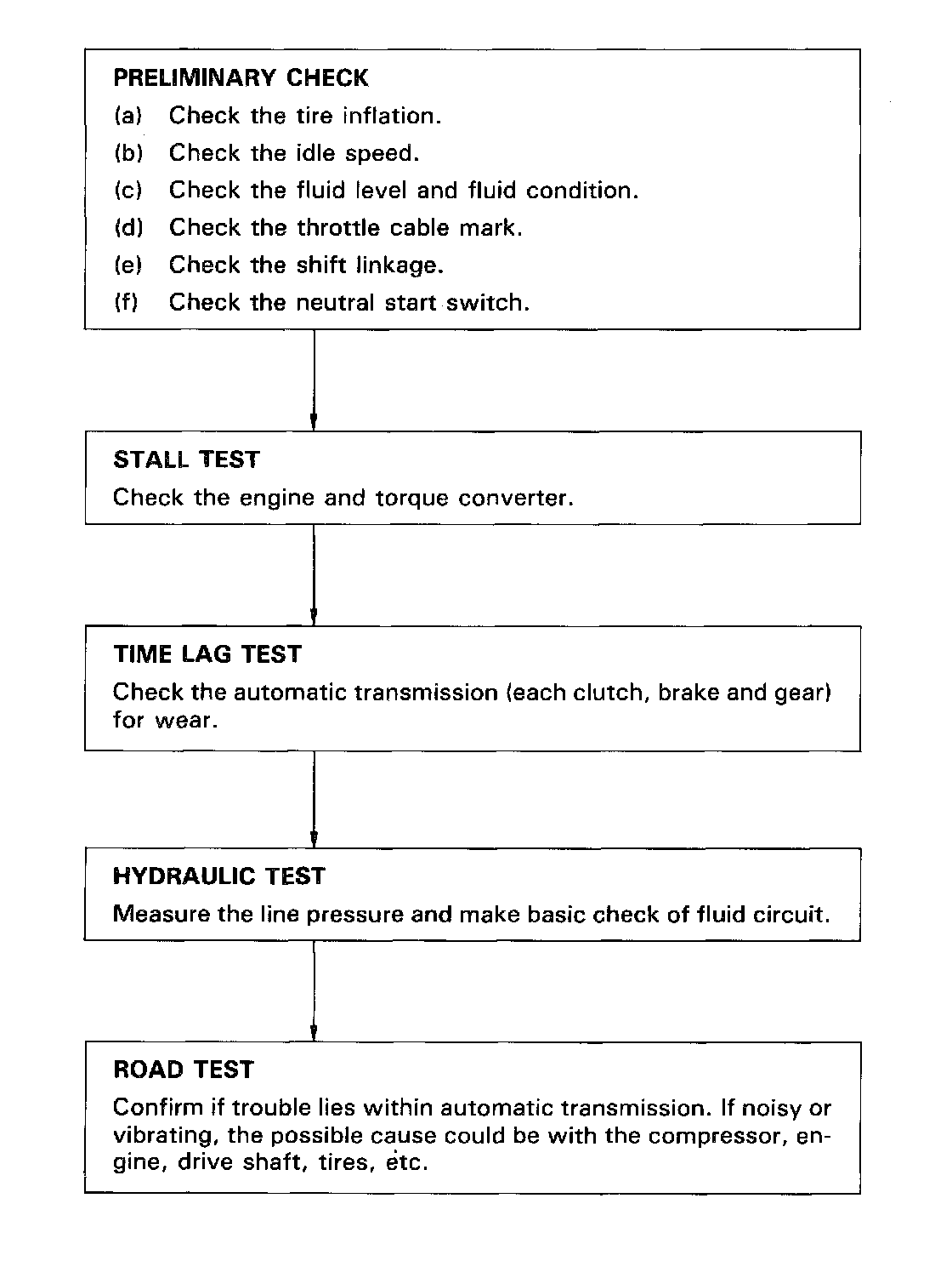 1. Troubles occuring with the automatic transmission can be caused by either the engine or the transmission itself These two areas should be distinctly isolated before proceeding with troubleshooting.2. Troubleshooting should begin with the simplest operation, working up in order of difficulty, but first determine whether the trouble lies within the engine or transmission.