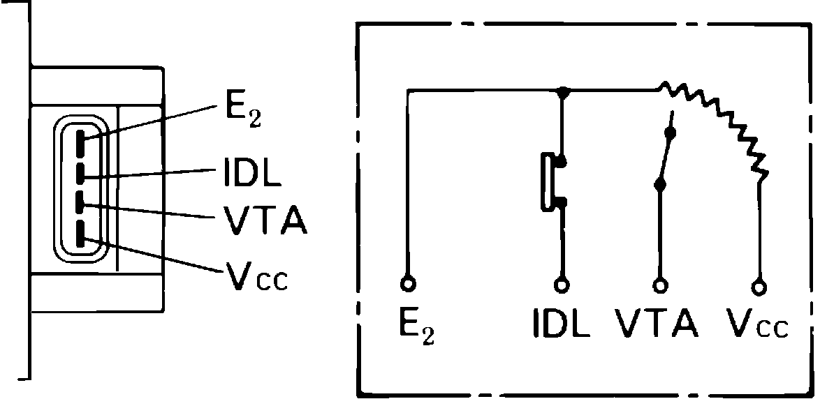 a. With throttle closed, measure between terminals VTA and E2, Fig. 73. Resistance should be 0.3---6.3 kilo ohms.