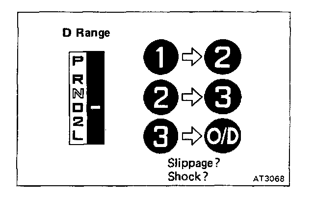 d. While running in the D range, 2nd, 3rd and O/D gears, check to see that the possible kick-down vehicle speed limits for 2 -> 1, 3 -> 2 and O/D 3 kick-downs conform to those indicated on the automatic shift schedule.