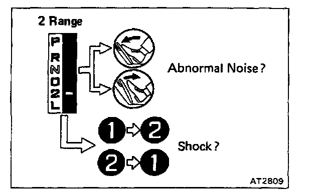 Shift into the 2 range and, while driving with the accelerator pedal held constantly at the full throttle valve opening position, push in one of the pattern selectors and check on the following points.