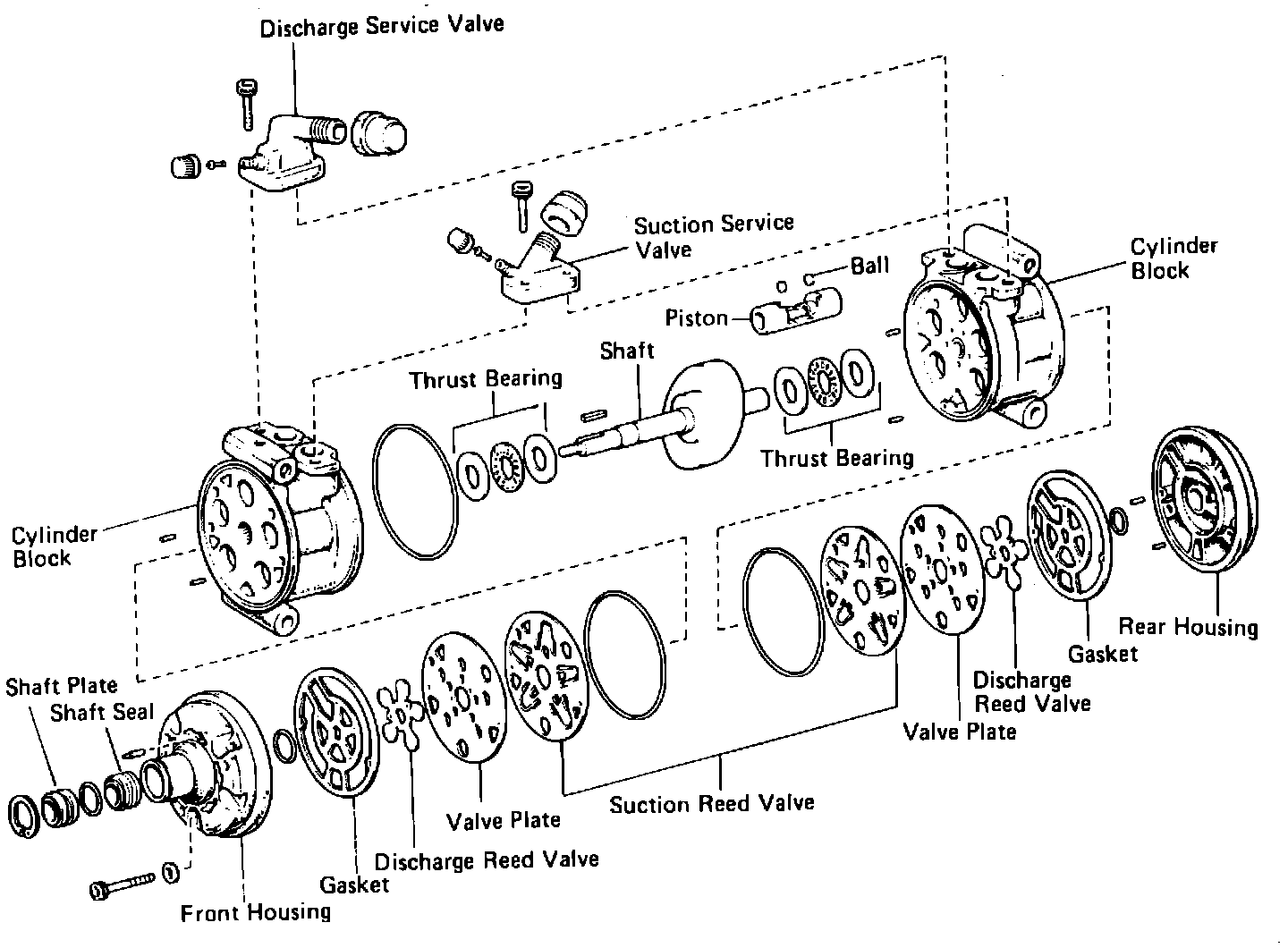 Exploded view of typical Nippondenso 10 cylinder compressor: