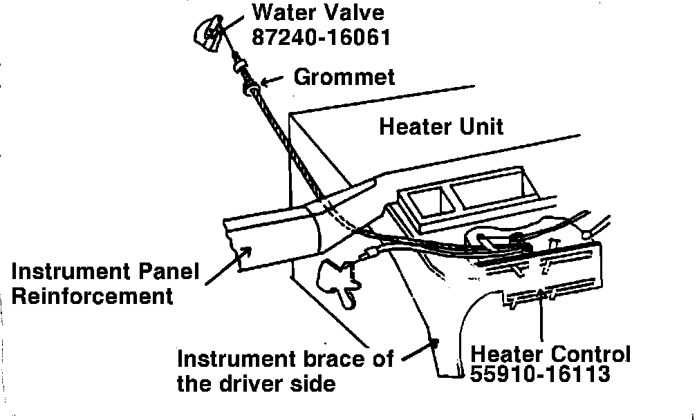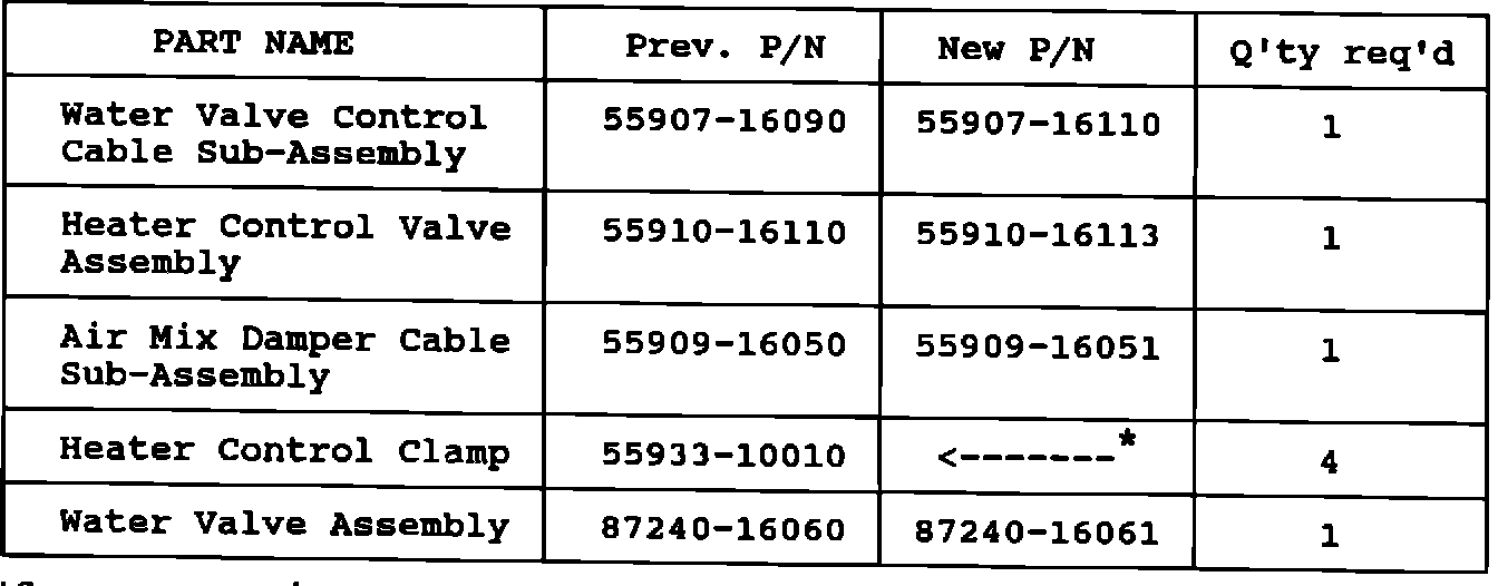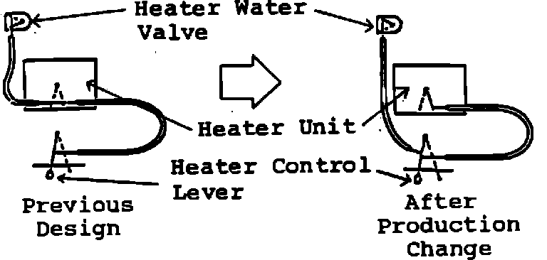 To reduce the effort required to operate the heater control lever, the cable assemblies, water valve assembly, and the heater control valve have been redesigned. The production change is effective from the frame and date shown below: