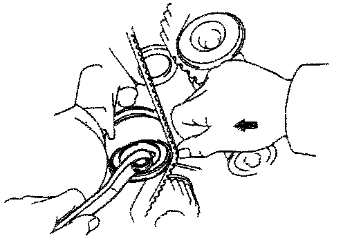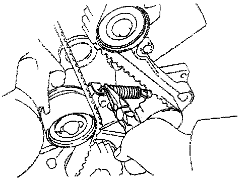 HINT: If reusing the timing belt, draw a direction arrow on the belt (in direction of engine revolution), and place matchmarks on the pulleys and belt as shown.