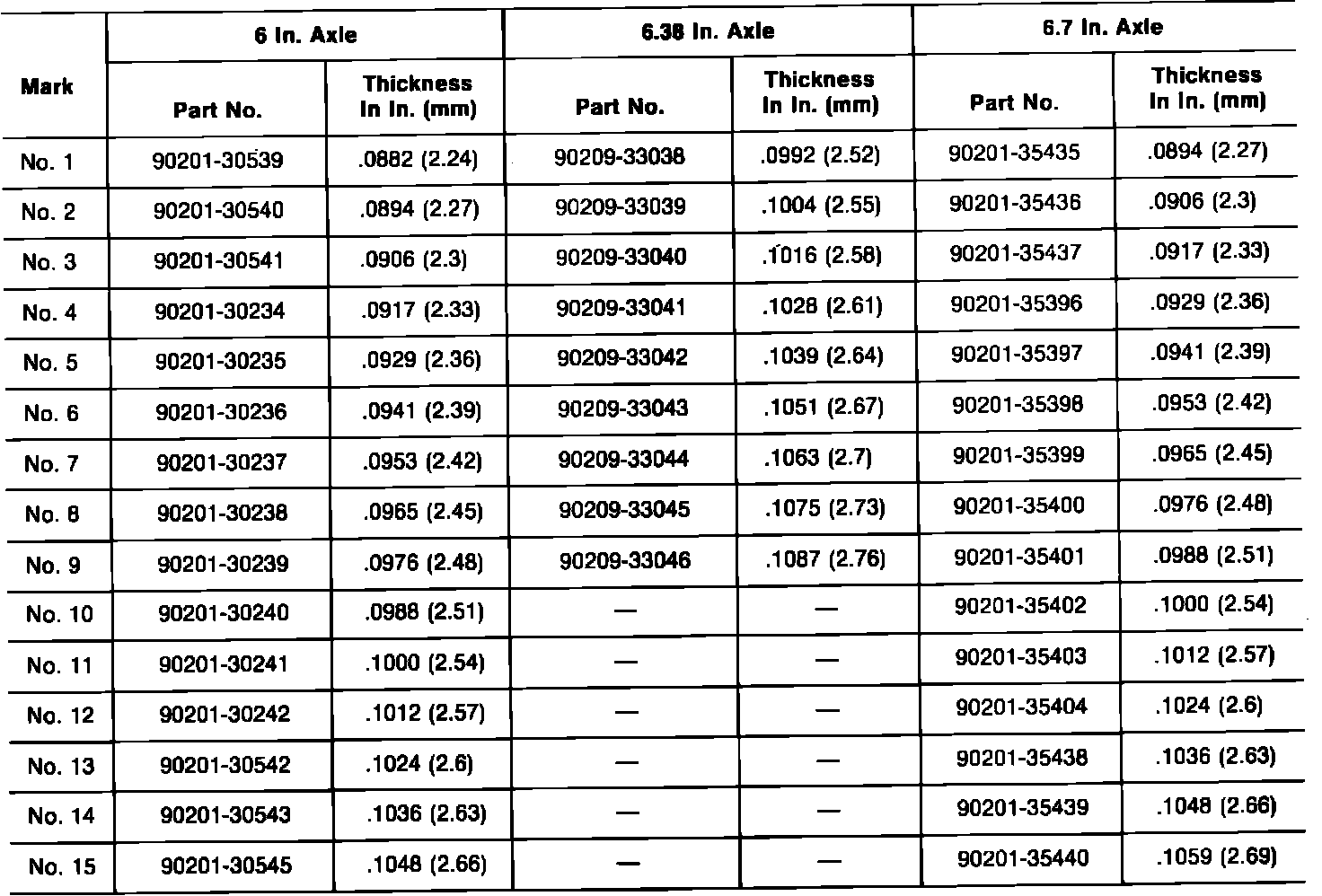 Fig. 15 Side gear thrust washer identification. Corolla RWD & Tercel 4 wheel drive: