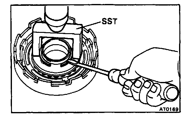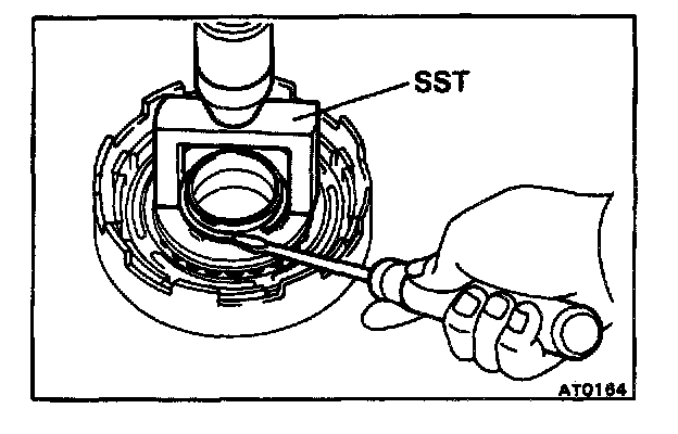 Place SST on the spring retainer and compress the springs with a shop press. Using a screwdriver, remove the snap ring.