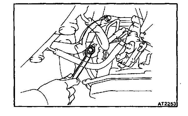 b. Hold the crankshaft pulley nut with a wrench and remove the six bolts.