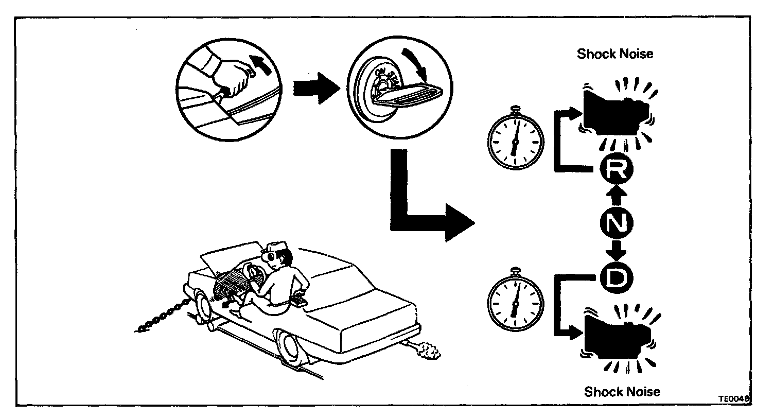 c. Shift the shift lever from N to D range. Using a stop watch, measure the time it takes from shifting the lever until the shock is felt.