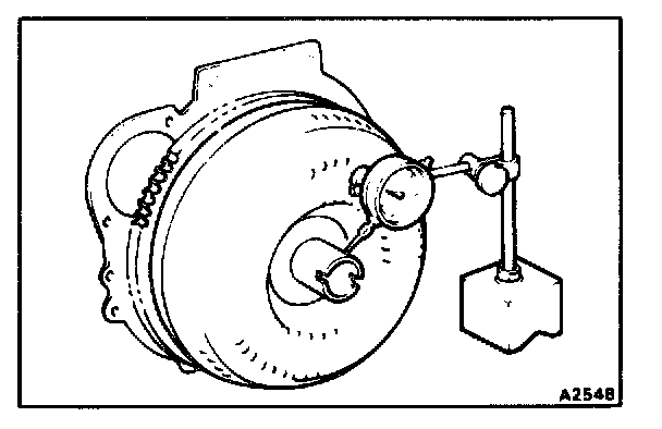 a. Temporarily mount the torque converter to the drive plate. Set up a dial indicator.