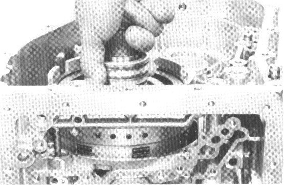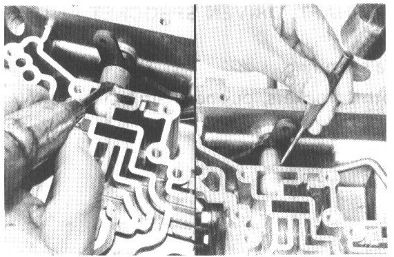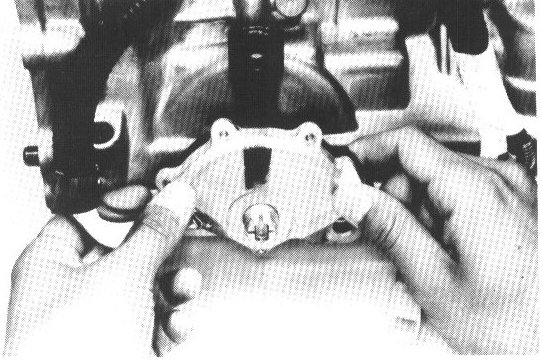 Position a rag to catch each piston. Using low-pressure compressed air (1 kg/sq.cm , 14 psi or 98 kPa max.) pop each piston into the rag. Force air into holes shown, and remove the pistons and springs.