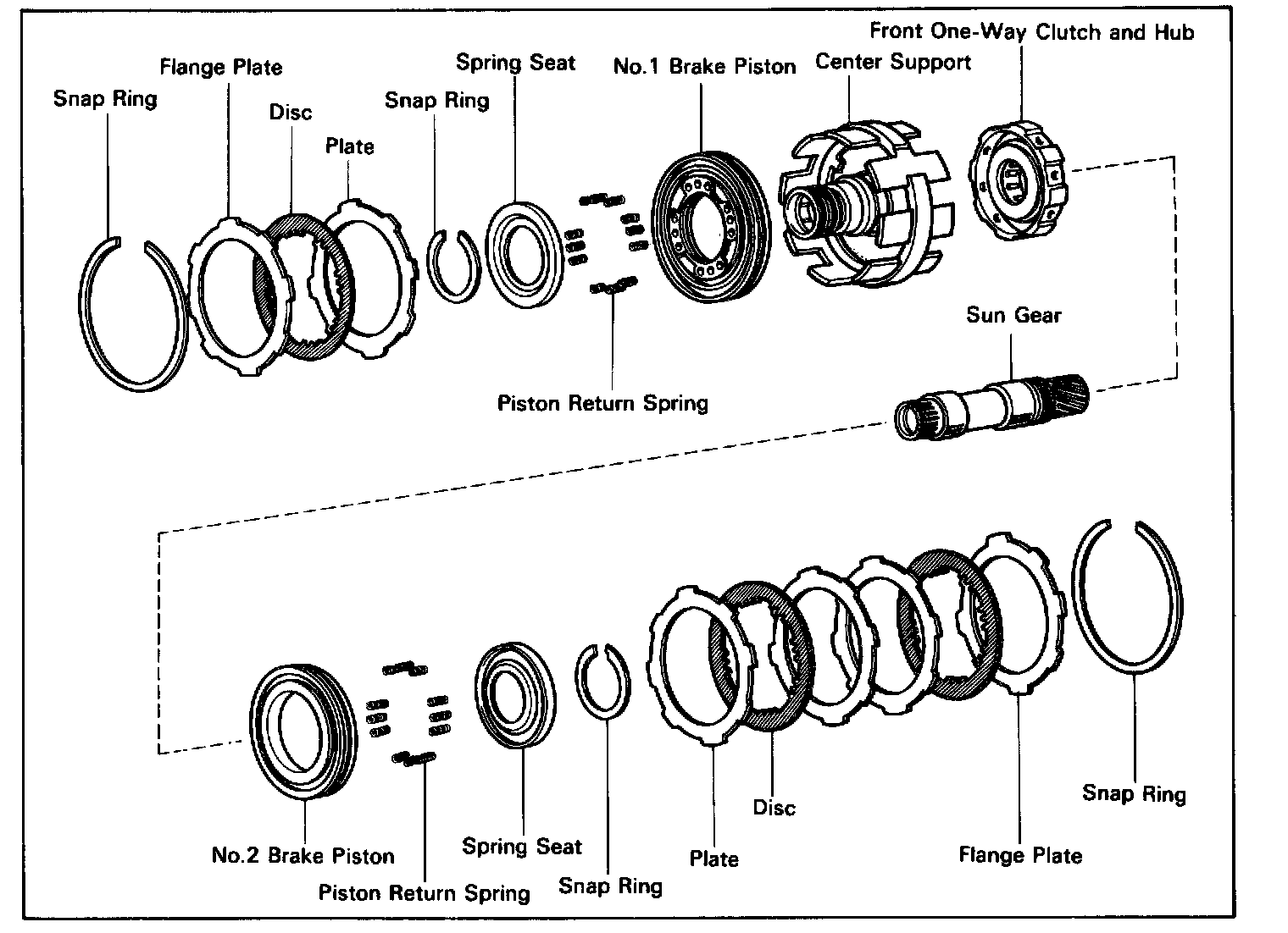 Hold the No.2 brake hub and turn the sun gear. The sun gear should turn freely counterclockwise and should lock clockwise.