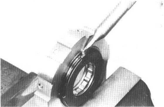 b. Pry off the retainer with a screwdriver. Leave the other retainer on the hub.