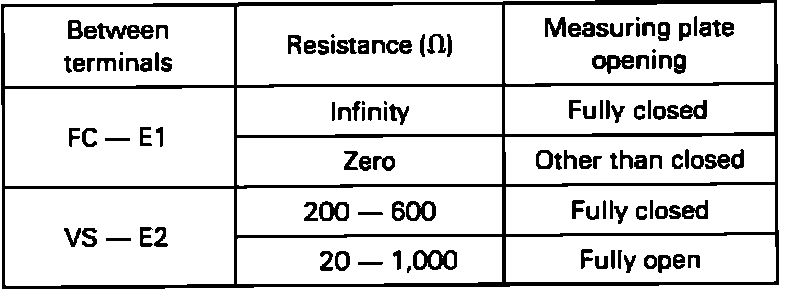 1. Disconnect Air Flow Meter connector.2. Using an Ohmmeter, measure the resistance between each terminal. (Refer to chart)