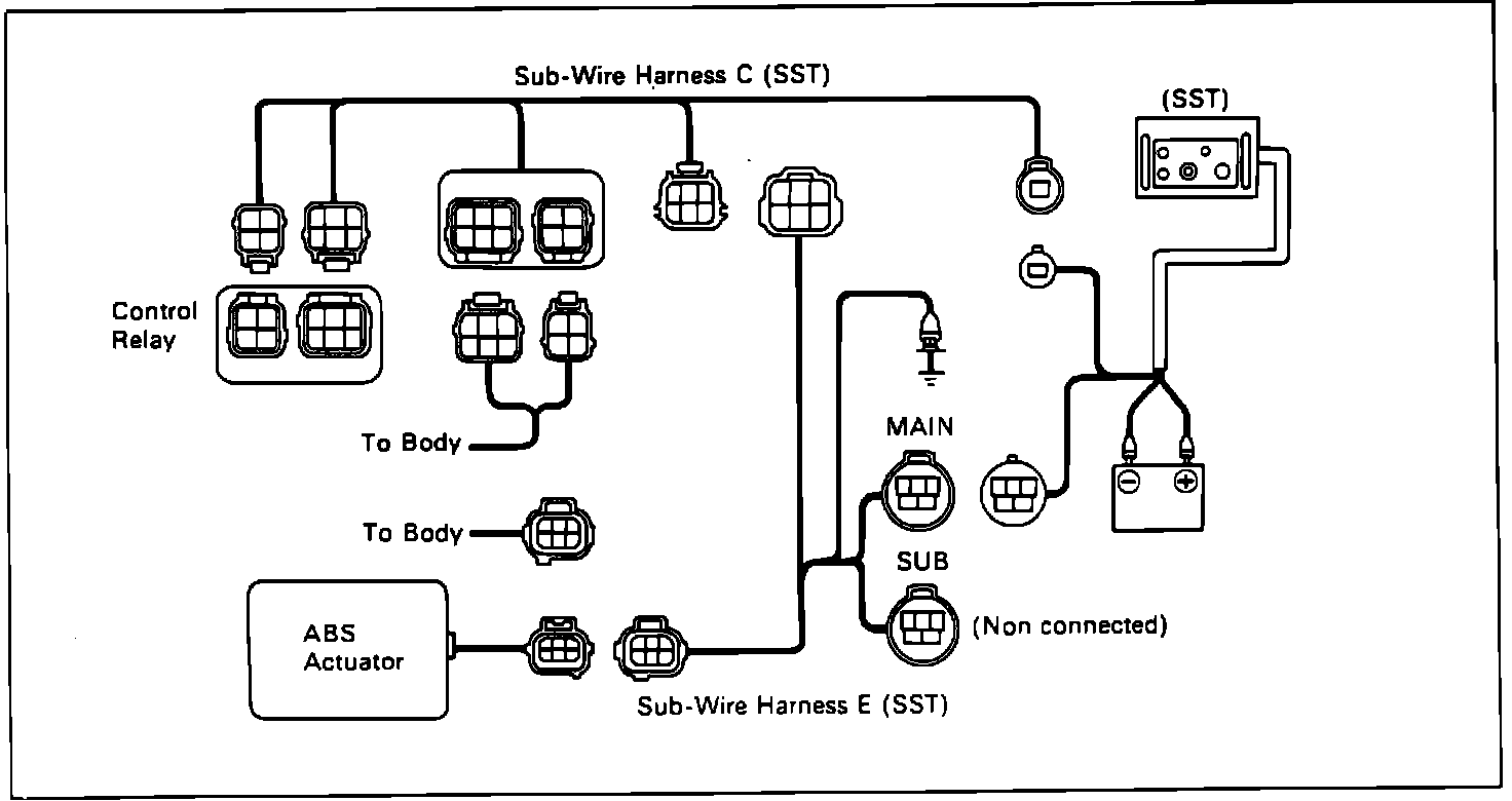 4. Connect actuator checker (SST-09990-00150) to the actuator, control relay and body side wiring harness through the sub-wiring harness C and E. Connect the red cable of the checker to the battery positive (+) terminal and the black cable to the negative (-) terminal. Connect the black cable of the sub-wiring harness (SST-09990-00150 - 09990-00210) to the battery negative (-) terminal or body ground. Place the "SHEET A" overlay (SST-09990-00163) on the actuator checker.