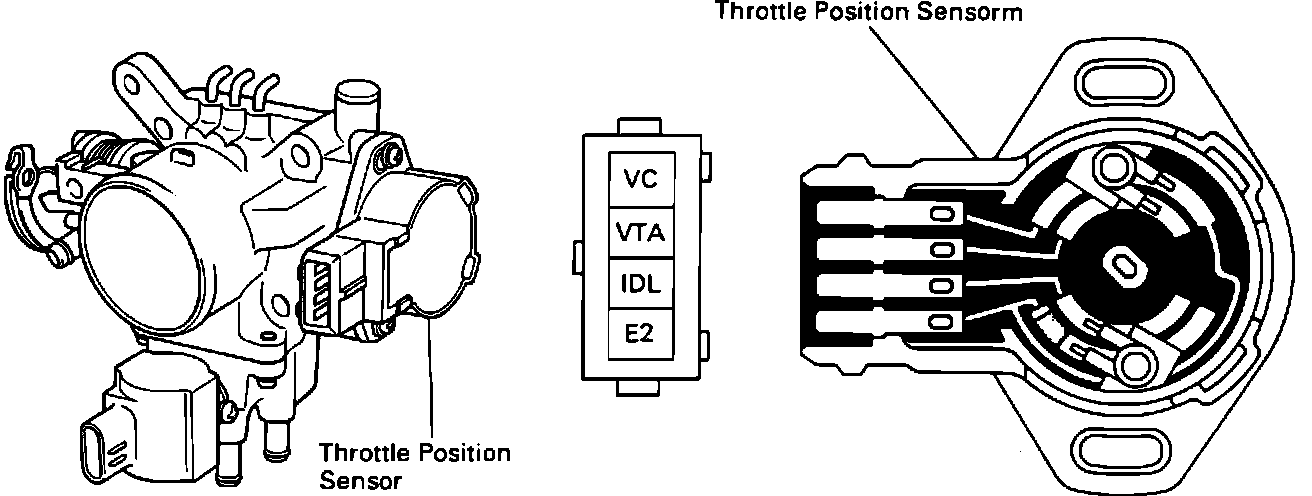 The TPS is mounted on the throttle valve body and sends a varying voltage signal to the ECU based on throttle valve position. The ECU can then adjust fuel delivery based on acceleration, deceleration, full throttle (WOT) or idle. The TPS inputs the ECU through terminal PSW, (on models w/o Electronic Controlled Transaxle), or terminal VTA, (on models with Electronic Controlled Transaxle).