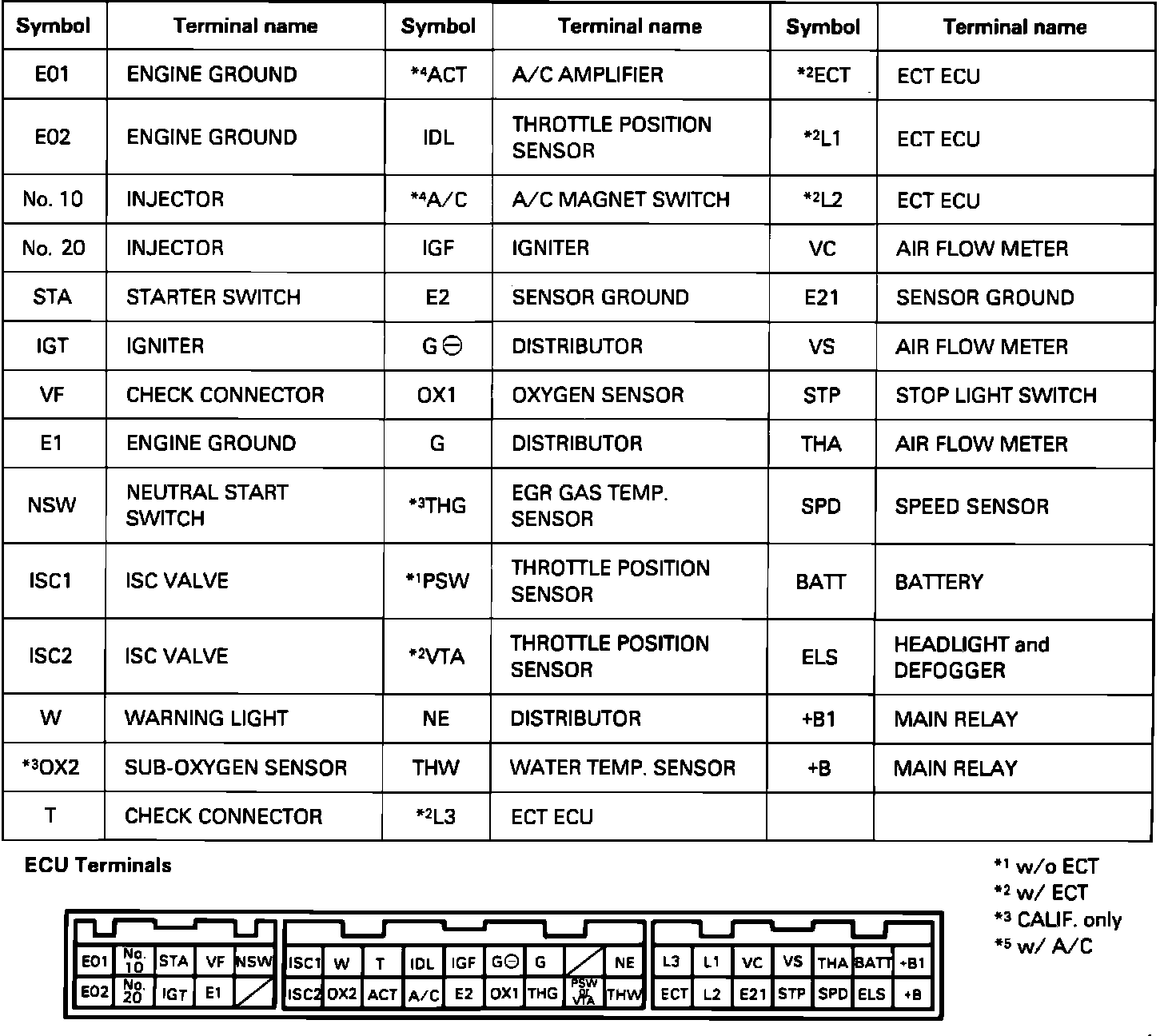 4. If voltage was present in step #3, inspect wiring and connection between ECU terminal E1 and body ground. If wiring and connection were not at fault replace ECU.