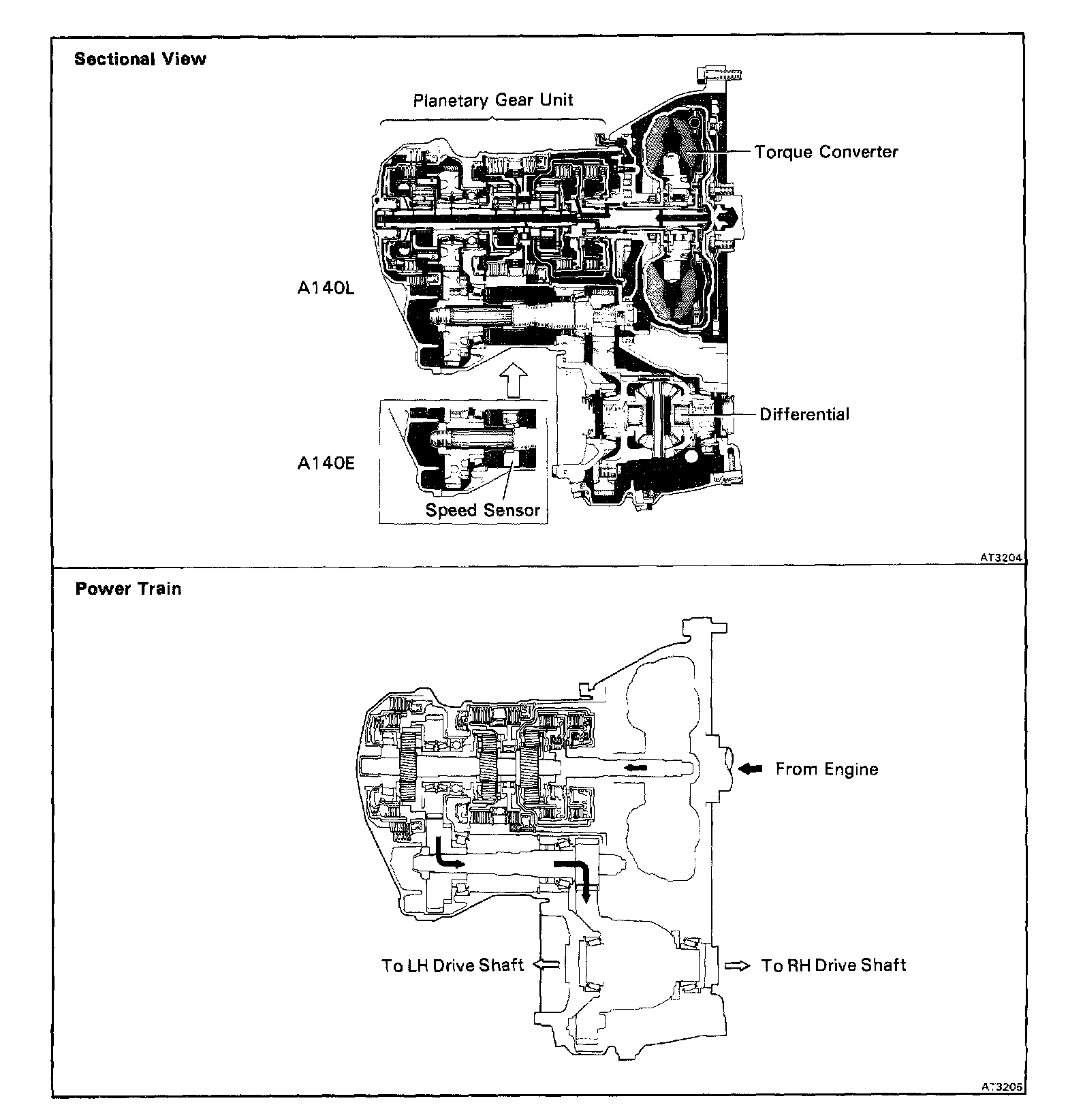 The A140E is called an ECT (Electronic Controlled Transaxle). Based on the A140L, the hydraulic control system has been changed, and the shift and lock-up timing are controlled by micro computer.