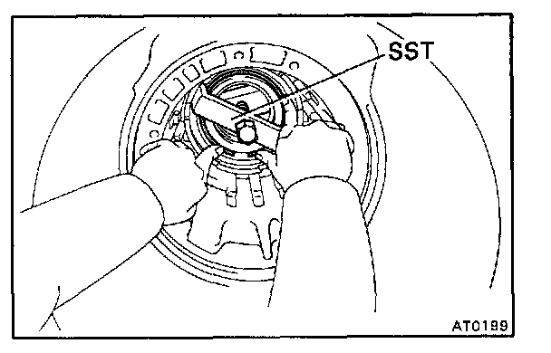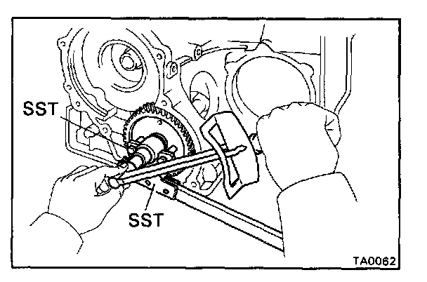 b. Using SST to hold the gear, tighten the nut.