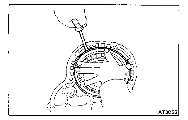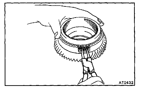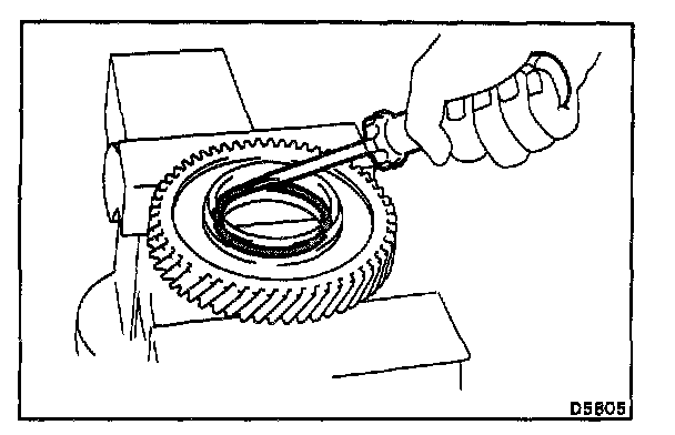 a. While pulling up the ring gear, compress the snap ring with needle-nose pliers and remove it from the groove.