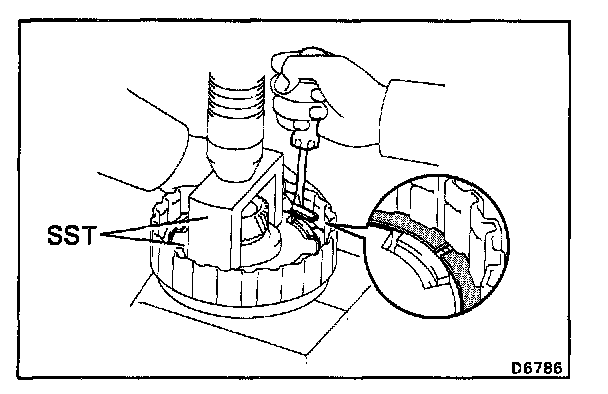 c. Install the snap ring with a screwdriver. Be sure end gap of snap ring is aligned with the groove of the clutch drum.