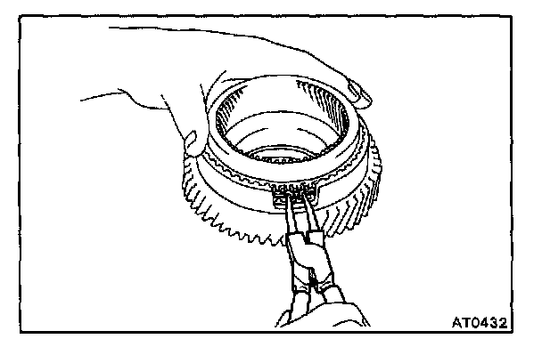 While pushing down the ring gear, squeeze the snap ring end with a needle nose pliers, and install it into the groove.