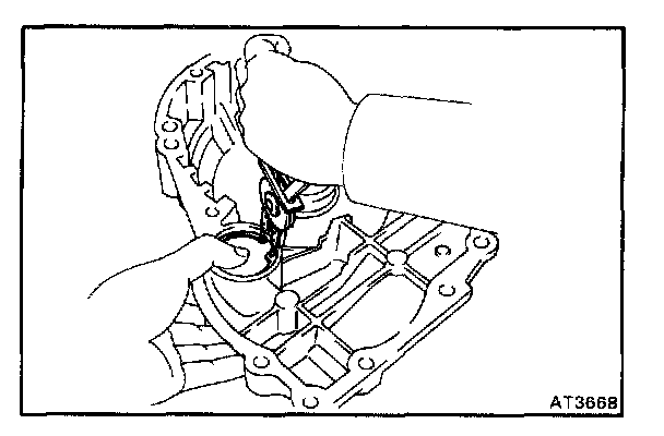 NOTE: Press in the two outer races until they touch the snap ring. Tap the races in straight, so that they do not tilt